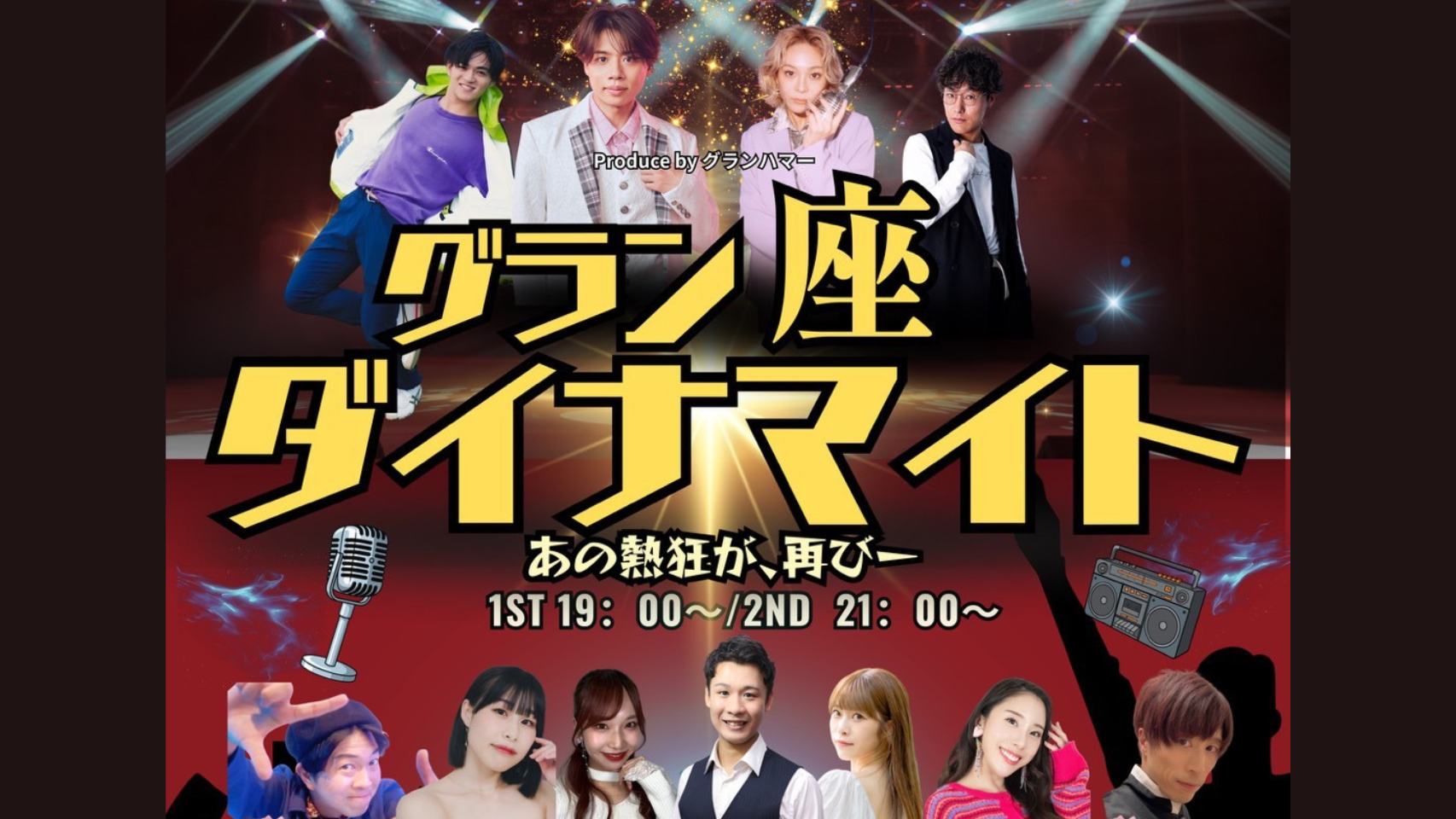 昭和と平成の名曲を舞台に、歌・ダンス・アクロバットが織りなす30分のノンバーバルエンターテイメント。時代を越えて蘇る「レトロ・座・ダイナマイト」が、心に眠る情熱を呼び覚ます。