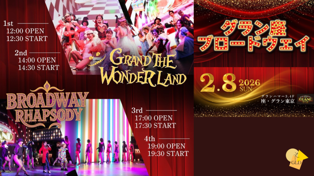 日時 2026/2/8(土) OPEN / START グラン座Wonder Land【1st】12:00 / 12:30【2nd】14:00 / 14:30 BROADWAY RHAPSODY【1st】17:00 / 17:30【2nd】19:00 / 19:30 ※各回終了後、特典会・面会を実施いたします。 会場 グランハマー3F 『座・グラン東京』 〒1... -